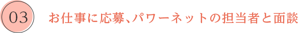 お仕事に応募いただいた場合は、ご来社の上、パワーネットの担当者が面談させて いただきます。