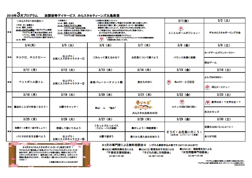 お花見、手作りのボーリング大会など3月も盛りだくさんのプログラムをご用意しています
